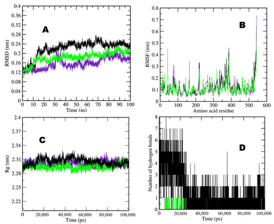 Two-dimensional graphs showing (A) RMSD plot of AChE in water (purple), AChE–taxifolin (black), and AChE–donepezil (green) deviation during 100 ns period; (B) RMSF plot with fluctuation per residues; (C) radius of gyration (Rg) plot showing compactness of protease molecule during 100 ns simulation; and (D) hydrogen bond plot showing formation hydrogen bond. Where nm = nanometer; ps = picosecond. AChE:Purple; AChE-Donzepil: green; AChE-Taxifolin: black.