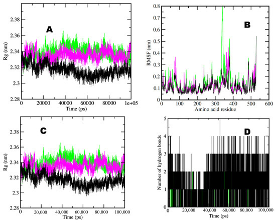 Two-dimensional graphs showing (A) RMSD plot of BChE in water (pink), BChE–taxifolin (black), and BChE–donepezil (green) deviation during 100 ns period; (B) RMSF plot with fluctuation per residues; (C) radius of gyration (Rg) plot showing compactness of protease molecule during 100 ns simulation; and (D) hydrogen bond plot showing formation hydrogen bond. Where nm = nanometer; ps = picosecond. AChE:Purple; AChE-Donzepil: green; AChE-Taxifolin: black.