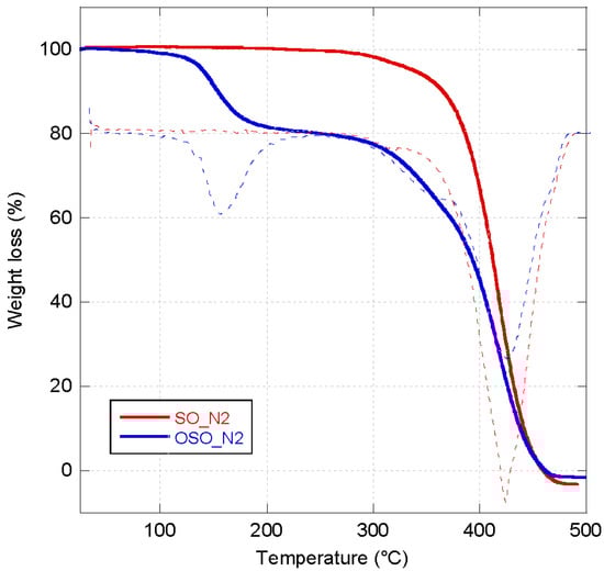 TGA thermograms (thick line) and related DTG (dotted line) of SO (red curve) and OSO (blue curve) measured under the N2 atmosphere.