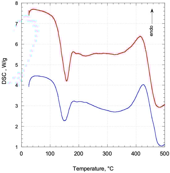 A PerkinElmer (Waltham, MA, USA) STA6000 instrument was used to carry out simultaneous thermogravimetric (TGA) and differential scanning calorimetry (DSC) analysis under a nitrogen atmosphere (40 mL min−1). Four milligrams of the sample were placed in an alumina crucible using a micropipette, and measurements were performed in the temperature range of 25−500 °C (heating rate: 10 °C min−1; temperature accuracy: ±1 °C). Each analysis was carried out in triplicate.