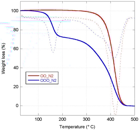 TGA thermograms (thick line) and related DTG (dotted line) of OO (red curve) and OOO (blue curve) measured under the N2 atmosphere.