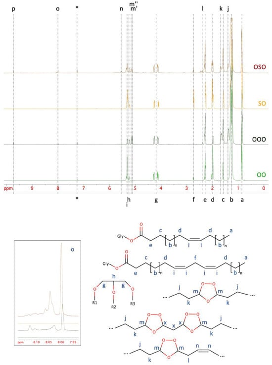 The H-NMR stack plot of the refined olive oil (OO) and sunflower seed oil (SO) and the corresponding ozonated oils, OOO and OSO, respectively. Lowercase letters are used to label the main resonances in the spectra. The ones already present in the refined oils are reported along the bottom side, while those that appeared after ozonation are reported along the top side of the plot. The asterisk is used to label the residual CHCl3 resonance. The region around 8 ppm is expanded in the left bottom corner of the figure. The Lewis structures (H atoms are not shown for clarity) of the typical vegetable oil components and the identified ozonation products are shown together with lowercase letters to indicate resonance assignments. The label “x” is used to indicate missing (or very low) resonances.
