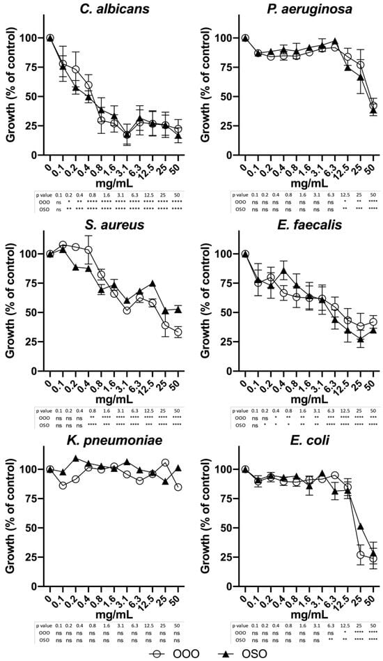 Bactericidal effect after 24 h treatment with ozonated olive (OOO) and sunflower (OSO) oils assessed by microdilution assay. Data are expressed as the means ± standard errors in the percentage of the control’s growth as a function of the concentration (x axis). Below each graph, the p values are reported vs. untreated control as calculated by 2-way ANOVA and Fisher’s LSD test. * p < 0.05; ** p < 0.01; *** p < 0.001; **** p < 0.0001; ns, not significant.