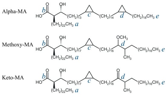 MAs are 2-alkyl-3-hydroxy long-chain fatty acids that have slightly different chain lengths and additional chemical groups both across and within species [9,10,11,12,13]. In the Mtb outer wall, the most abundant components are α-mycolic acid (AMA), ketomycolic acid (KMA), and methoxymycolic acid (MMA) (Figure 1). All of them are β-hydroxy acids with linear chains of 60–90 carbon atoms [14]. These molecules have a linear aliphatic chain of about 23 carbon atoms (fragment a–b in Figure 1) at the α-position with respect to the COOH group (b) and a hydroxy group at the β-position, corresponding to the (2R,3R) stereochemistry. Two more groups are found at positions c and d inside a long hydrocarbon (meromycolate) chain. AMA has cis-cyclopropane rings inserted in both the proximal (c) and the distal (d) positions with respect to the carboxyl group. It is usually the most abundant type of MA in Mtb, comprising from 50% to 70% of the total MA content [15,16,17]. MMA and KMA, collectively comprising from 30% to 50% of the total MA content, have either cis- or α-methyl-trans-cyclopropane rings inserted in the proximal (c) position, and, respectively, methoxy and methyl or keto and methyl substituents in the distal (d) position [12,14].