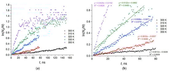One of the characteristics most sensitive to temperature is the conformational composition of the membranes. It was shown earlier [44] that even at 300 K, the conformational composition changes markedly during the first 500–600 ns of the MD trajectory. These changes in the case of the AMA_W membrane represented the transformation of the basic initial W conformation into other conformation types that obeyed the first-order reaction kinetics. At the increased temperatures, this feature was retained. Figure 2a shows the temperature dependence of the ln(N0/N) kinetic curves (where N0 and N are the initial and current counts of the W conformation molecules in the AMA_W membrane, respectively) in the time range of 100–160 ns. It can be seen that at higher temperatures, the kinetic curves reach a plateau by 30–100 ns. The initial sections of the curves (in the time range of 0–50 ns) are shown in Figure 2b. It can be seen that all kinetic curves are close to linear, confirming the first kinetic order of the W conformation “decay” process. Its apparent decay rate constant k is expected to follow the Arrhenius equation: