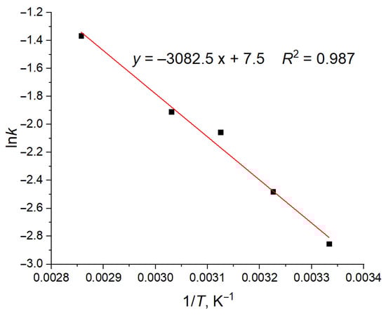 Dependence of the logarithm of the rate constant of W conformation decay in the AMA_W membrane on the inverse temperature. Individual data points (black squares) and linear regression model (red line) are shown.