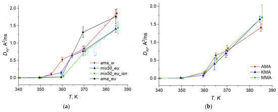 In the ionized membrane, the ionized and non-ionized AMA molecules were characterized by a common diffusion coefficient. Table 2 summarizes the diffusion coefficients of the KMA and MMA molecules in the Mix50_eU membrane. The temperature dependencies of the lateral diffusion coefficient Dxy for different MA components in the membranes of different types are shown in Figure 4.