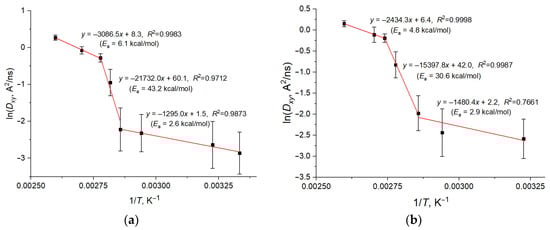 Dependence of ln(Dxy) on the inverse temperature for (a) AMA in AMA_W; (b) AMA in Mix50_eU. The expressions on the panels give the linear regression models and the corresponding determination coefficients for three intervals of linear dependence. Values in parentheses are the apparent activation energies derived from the slope coefficients of linear intervals.