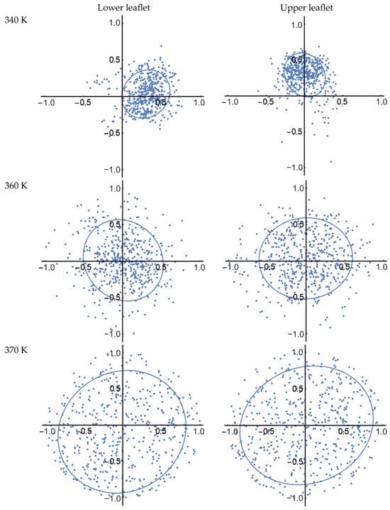 where x and y are the components of the vector . Thus, the orientation of each molecule i in the membrane is represented by a two-dimensional normalized vector , which, at any moment in time, falls within a unit circle in the OXY plane. The distribution of vectors characterizes the directional ordering of MA molecules in the membrane. Figure 6 shows the distributions of the orientation vectors of the AMA molecules in the Mix50_eU membrane at three different temperatures (see also Table S1 in the Supplementary Materials for the time evolution of in the same membrane at T = 340 K). The left and right panels correspond to the lower and upper membrane leaflets. The plots also show the (third) quartile ellipsoids, which cover three quarters of the distributed points.