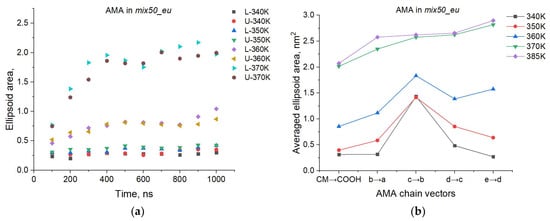 The size of quartile ellipsoids can be characterized by their area (a, b are the ellipsoid semiaxes), which varies with time and depends on the temperature. For this analysis, we used the averaged S values at different time points of the 0–1000 ns MD trajectories (in 100 ns steps) for different membranes at different temperatures. Figure 7a shows the typical changes in S for the AMA molecules in the top and bottom leaflets of the Mix50_eU membrane over time from 0 to 1000 ns with increasing temperature. It can be seen that there are no significant S changes with time at the temperatures of 340 and 350 K. This means that the tilt angles of the AMA molecules fluctuate within narrow limits and that the membrane remains structurally ordered. When the temperature increases to 360 K and especially to 370 K, a significant increase in S is observed, reflecting a strongly disordered orientation of the molecules.
