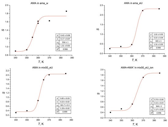 The optimized regression parameters and the statistical characteristics of the models are shown in Figure 8. As can be seen, the phase transition temperature (represented by the x0 parameter) for the AMA_W membranes is 355 K, while for the membranes based on the eU conformations, this temperature is noticeably higher, ranging from 361 to 365 K. This difference is consistent with the conclusions made in the previous studies, which are that the membranes based on the elongated eU conformations are significantly more stable than the others. Moreover, the transition temperature is very weakly influenced by the degree of ionization of the membrane molecules (i.e., pH of the medium) or the presence of the KMA and MMA components.