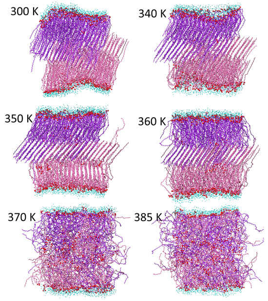 The structural rearrangement evidenced by the nonlinearity of the temperature dependence of the diffusion coefficients is also visually apparent when analyzing the molecular structure of the membranes. With increasing temperature, the membrane changes from the fully ordered “gel” (Lo) bilayer phase (characterized by the consistent conformations and orientations of the molecules), to the partially disordered liquid crystal bilayer state, and finally to the bulk liquid melt (3D disordered) phase.