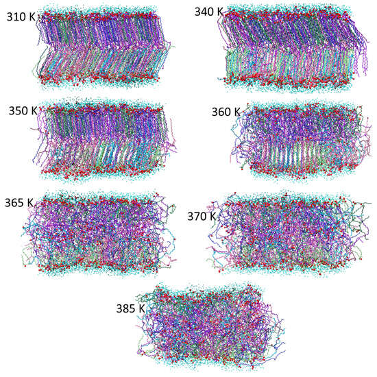 The conclusions regarding the membrane phase transitions are further confirmed by the direct inspection of the final (end of trajectory) membrane structures at the different temperatures shown in Figure 9, Figure 10 and Figure 11 for the AMA_W, AMA_eU, and Mix50_eU membranes, respectively. At low temperatures (300–310 K), the gel-like structures with polar groups exposed to the water are observed. In AMA_W, the MA molecules of both leaflets are tilted in a similar way and fully interdigitated. In AMA_eU, three layers cross-tilted at different angles are observed, with the middle layer formed by interdigitated tails of the elongated meromycolate chains. In Mix50_eU, there are two cross-tilted layers linked by interdigitated tails of the elongated AMA meromycolate chains. At a moderate temperature (340 K), the membranes retain these basic structures; however, in some cases, the orientation of the molecules may be slightly changed and the membranes may become slightly more ordered with respect to slant angles and interface surfaces.
