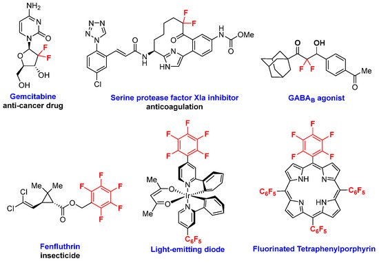 The widespread applications of fluorine-containing organic molecules and their derivatives in pharmaceuticals, agrochemicals, polymers, dyes, and optical functional materials have raised demand greatly in recent years [7,8]. Up to now, a series of synthetic methods for accessing new fluorine-containing compounds have been developed [9,10,11]. Among the existing organofluorine compounds, gem-difluoromethylene and perfluorinated arene-containing molecules have long been recognized as fascinating targets for organic synthesis due to their special structures and important properties (Figure 1) [12,13,14].