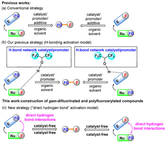 Accordingly, two general approaches have been developed for the construction of such compounds [12,15]. The first one is the nucleophilic difluoroalkylation and perfluoroarylation of electrophilic acceptors, and the second strategy is based on the addition of different nucleophiles to difluoromethylene- and perfluorinated arene-containing reaction partners. Due to the low reactivities of most fluorine-containing reactants, catalysts, promoters or additives are essential for enabling the reactions to proceed smoothly (Scheme 1a) [16,17,18,19]. Although significant progress has been made, these methodologies usually show some drawbacks such as requiring expensive metal Lewis acid catalysts, strong acid catalysts, volatile organic solvents, relatively high temperatures and longer reaction periods. To further activate fluorine-containing reactants under mild conditions, a new activation model for nucleophilic difluoroenoxysilane and electrophilic difluoroacetaldehyde ethyl hemiacetal has been developed by our group, using 1,1,1,3,3,3-hexafluoro-2-propanol (HFIP) as the organocatalyst or promoter in various cases due to its high H-bond donating ability, mild acidity and strong cation stabilization (Scheme 1b) [20,21]. In those processes, fluorine-containing reactants were activated via strong hydrogen bonding and the competing side reactions were significantly suppressed. In addition, it should be pointed out that although quite a number of neat reactions have been developed to generate structurally diverse molecules over the past decades, reports on the efficient construction of fluorine-containing organic molecules without solvent or catalyst are fairly limited [22,23,24,25]. Thus, considering the formation of hydrogen bonds between the reactants and HFIP, we were interested in determining whether the non-fluorinated reactants could be activated by fluorinated reactants directly through the intermolecular hydrogen-bond interactions without the participation of additional catalysts (Scheme 1c). In this context, we report a novel solvent- and catalyst-free method for the efficient synthesis of gem-difluorinated and polyfluoroarylated compounds with nucleophilic and electrophilic fluorine-containing reaction partners. To the best of our knowledge, this is the first report on the direct reaction with nucleophilic difluoroenoxysilane and electrophilic pentafluorobenzaldehyde in neat conditions without a solvent and catalyst.