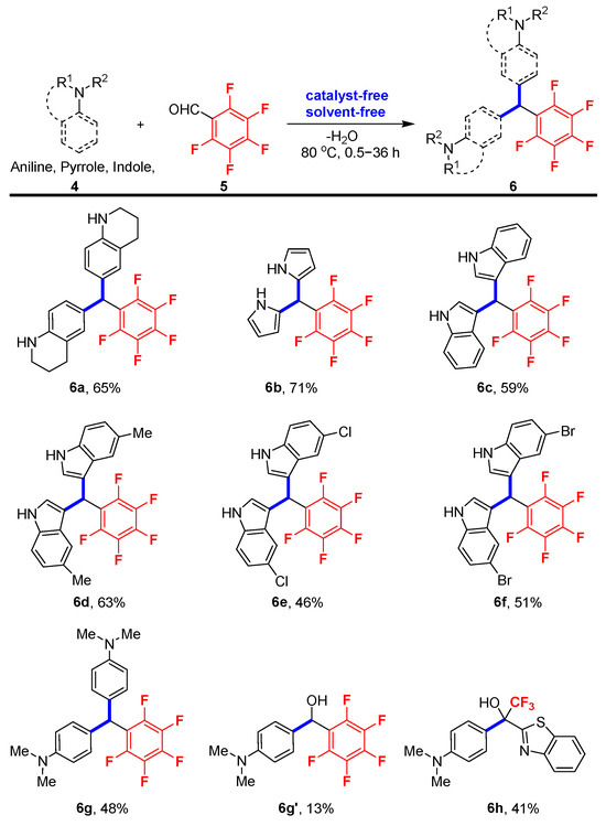 Having developed an efficient procedure for the preparation of gem-difluorinated 2-hydroxy-1,4-dicarbonyl compounds, we next turned our attention to investigating the synthesis of polyfluoroarylated compounds with pentafluorobenzaldehyde through the nucleophilic attack pathway. As depicted in Scheme 3, pentafluorobenzene-derived bis(tetrahydroquinolinyl)methane 6a, bis(pyrrolyl)methanes 6b and bis(indolyl)methanes 6c–6f were obtained in moderate yields within 0.5–6 h. Meanwhile, for N,N-dimethylaniline 4g without free NH moiety in the molecular skeleton, the reaction rate was greatly slowed down. Both the bis(aryl)methane product 6g (48% yield) and the direct hydroxyarylation product 6g’ (13% yield) were produced despite the reaction time extending to even six times longer than before (36 h). It should be noted that benzothiazole-bearing trifluoromethyl ketone hydrate was also a viable substrate for this neat reaction, although only 41% yield was achieved for product 6h. And it should be noted that a relatively higher temperature (80 °C) was required for the reaction of pentafluorobenzaldehyde with these different reactants in order to improve the reaction yields (see the Supplementary Materials for complete details of reaction optimization).