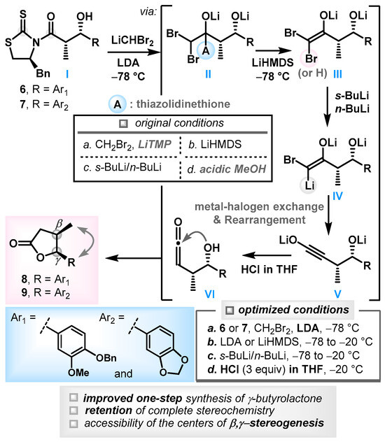 The following is a simplified representation of the transformation mechanism for the preparation of the key γ-butyrolactone skeleton. Our process is initiated by the preparation of dibromomethyllithium from methylene bromide and lithium diisopropylamide (LDA), followed by the addition of 6 and 7 to the dibromomethyllithium solution, resulting in the tetrahedral intermediate, II. The subsequent treatment of the intermediate, II, with LiHMDS is expected to result in the di- and monobromoketone enolates, III. This is followed by the generation of the ynolate anion, V, via the metal–halogen exchange rearrangement of IV. The chiral γ-butyrolactones could then be formed by quenching the ynolate anion, V, in THF with HCl (3 equiv.), presumably via the successive intramolecular cyclization of the ketene intermediate, VI. It should be noted that one of the key factors in this process for the formation of intermediates II–V is the addition of reagents at −78 °C, followed by stirring at −20 °C for 90 s, which enables high yields of 8 and 9. Notably, the stereochemical outcome of the two vicinal stereogenic centers in γ-butyrolactones is conserved under these reaction conditions (see the Supplementary Materials for details). It should also be highlighted that by taking advantage of the great stereofacial selectivity of auxiliary-mediated asymmetric aldol processes, all the stereoisomers are accessible.