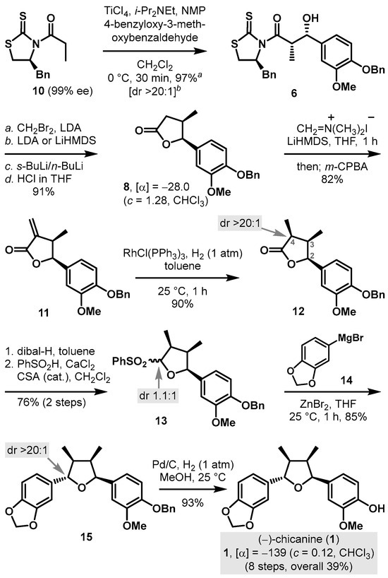Having successfully produced 12, our next focus was the crucial arylation of methylenedioxybenzene. The primary issue we encountered in the preparation of the stereoselective 2,3-cis-3,4-cis-4,5-trans-tetrahydrofuran was the occurrence of epimerization. To prevent this, we adopted Ley’s procedure [36,37,38], which involves the introduction of an organozinc reactant to the 2-benzenesulfonyl cyclic ether, 13, which was obtained in a 76% yield by the reduction of 12 with DIBALH, followed by treatment with PhSO2H and CSA in two steps. The subsequent nucleophilic substitution reaction of 13 with (1,2-methylenedioxyphenyl)zinc (II) bromide, generated in situ from (1,2-methylenedioxyphenyl)magnesium bromide and ZnBr2, resulted in an 85% yield of 2,3-cis-3,4-cis-4,5-trans-tetrahydrofuran, 15. It should be noted that we did not detect any other diastereomers at this stage. The final deprotection of the benzyl group (Pd/C, H2, MeOH, 93%) afforded natural (-)-chicanine (1, [α]D −139 (c 0.12, CHCl3) vs. reported [α]D −134.3 (c 1.01, CHCl3)) [11,39], which proved to be identical in all respects to the natural product. This demonstrates that the approach outlined in this report enabled the synthesis of (-)-chicanine in eight steps and in an overall yield of 39% from commercially available thiazolidinethione propionate, 10.