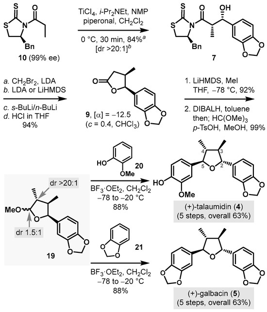 Another common γ-butyrolactone intermediate enabled the synthesis of two additional 2,5-diaryl-3,4-dimethyltetrahydrofuran lignans, named (+)-talaumidin (4) and (+)-galbacin (5). The syntheses of 4 and 5 began with the preparation of the key γ-butyrolactone, 9 (Scheme 4). The diastereoselective aldol addition of the chlorotitanium enolate of thiazolidinethione propionate, 10, with 3,4-methylenedioxybenzaldehyde yielded the syn-aldol adduct, 7, in an 84% yield, which was subjected to our modified one-carbon homologative lactonization to provide the desired γ-butyrolactone, 9, in a 94% yield. The subsequent asymmetric α-methylation of 9 (LiHMDS, MeI, THF, −78 °C) provided the desired 3,4-trans-dimethyltetrahydrofuran with excellent conversion and diastereoselectivity (92%, dr > 20:1). By employing one-pot reduction and acetalization, the lactone was cleanly converted to the cyclic methyl acetal, 19 (99%), and the ensuing Friedel–Crafts-type arylation reaction conditions (20, BF3∙OEt2, CH2Cl2, from −78 to −20 °C, 88%) proceeded to give (+)-talaumidin (4, [α]D +75.9 (c 0.16, CHCl3) vs. reported [α]D +88.3 (c 2.1, CHCl3)) [39] and [α]D +76.3 (c 0.28, CHCl3) [18]. Additionally, the synthesis of (+)-galbacin (5) was successfully achieved employing a Friedel–Crafts-type arylation process with 19 and 21, resulting in a yield of 88% ([α]D +121 (c 0.22, CHCl3) vs. [α]D +110 (c 1.0, CHCl3)) [20], and for which the properties in all respects proved to be identical with those of the known synthetic sample of the natural product. Both syntheses, which are among the shortest documented to date, comprised five sequential steps and resulted in yields of 63%.