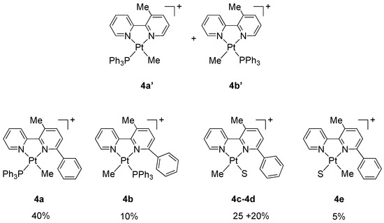 The 1H NMR spectrum of the obtained product shows the presence of at least five species, 4a (40%), 4b (10%), 4c (25%), 4d (20%), 4e (5%), tentatively identified as [Pt(N^N)L(Me)]+ cationic adducts (L = PPh3, water, or acetone) where the N^N ligand is 3-methyl-6-phenyl-2,2′-bipyridine (5).