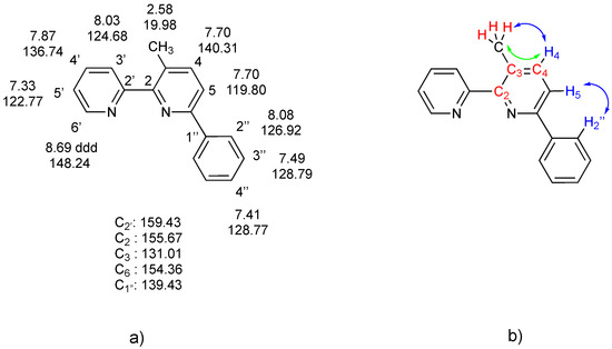 (a) (left): 3-Methyl-6-phenyl-2,2-bipyridine, 5, along with numbering scheme and complete 1H and 13C NMR assignment (CDCl3 solution) deduced from 2D NMR spectra; (b) (right) interactions revealed by 2D NMR spectra: (i) in red, proximity of CH3 protons with C2, C3, and C4, shown by cross peaks in the HMBC spectrum; (ii) in blue, NOE contacts between CH3 and H2” with the H4/H5 spin system (NOESY spectrum); (iii) in green, long-range interactions of CH3 protons and H5, revealed by the COSY spectrum.