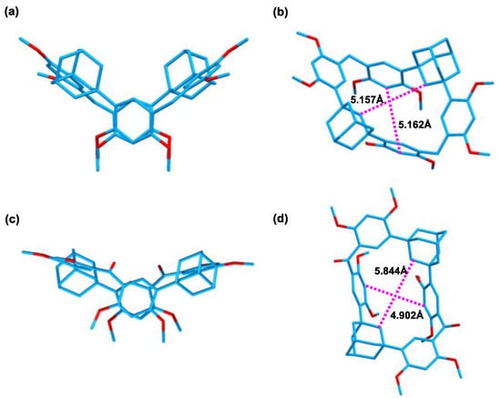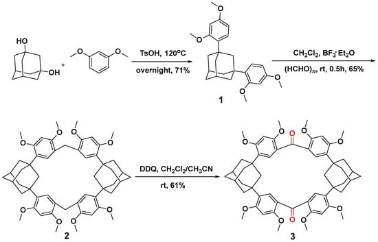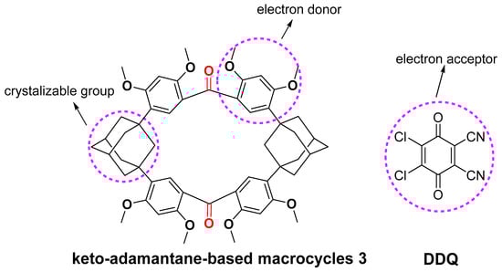 As for the fabrication of macrocyclic molecule-based CT cocrystals using new synthetic macrocyclic molecules, the following conditions should be satisfied. Firstly, π-donor or π-acceptor groups should be present in the macrocyclic molecules. Secondly, the macrocyclic molecule should easily form crystallized CT assemblies with guest molecules in the solid state through CT interactions. Thirdly, the preparation of macrocyclic molecules should be easy, and the raw materials should be cheap and easy to obtain. Adamantane and its derivatives, which have a highly symmetrical and rigid structure, can pack tightly with each other to form a lattice, and thus can easily form crystals in organic solvents; they have been widely used in the field of crystal engineering [,,,,,,,]. Building blocks 1,3-Dimethoxybenzene, that can act as π-donors, are frequently used in the construction of supramolecular macrocyclic molecules [,]. We reasoned that new macrocyclic molecules, made by combining easily crystallized adamantane groups with π-donor 1,3-dimethoxy-benzene units, might have the potential for the development of new macrocyclic molecule-based CT cocrystals with π-acceptor guests.