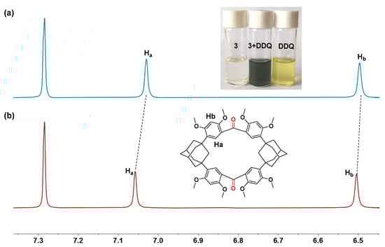 Partial 1H NMR spectra (400 MHz, CDCl3, 298 K) of (a) 3 and 1.0 equiv. of DDQ, and (b) free 3. [3]0 = 4.0 mM. Inset: photograph showing colors of 3, 3 + DDQ and DDQ in CHCl3.
