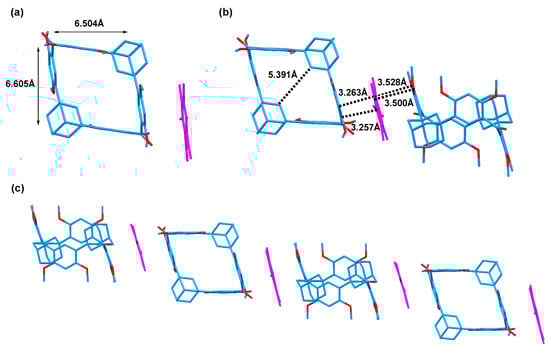 A dark green single crystal of 3@DDQ (CCDC: 2258294) that was suitable for X-ray analysis was grown by slow evaporation of the dichloromethane solution of 3 and DDQ in 1:1 molar ratio. As shown in Figure 4, after complexation with DDQ, 3 exhibited a box-like structure in the solid state with a size of 6.504 Å × 6.605 Å, and the 1,3-dimethoxy-benzene rings became parallel to the opposite one. The distance between these two C atoms of adamantane residue was measured to be 5.391 Å. The 1,3-dimethoxy-benzenerings of 3 and DDQ were orientated in a face-to-face manner and showed π···π stacking interactions with distances of 3.263 Å, 3.257 Å, 3.528 Å and 3.500 Å (f), which were indicative of strong CT interactions between these π-systems. Because of these multiple π…π stacking interactions, a linear supramolecular array between 3 and DDQ was further formed in the solid state. All these results suggested the formation of a novel macrocyclic molecule 3-based CT co-crystal.