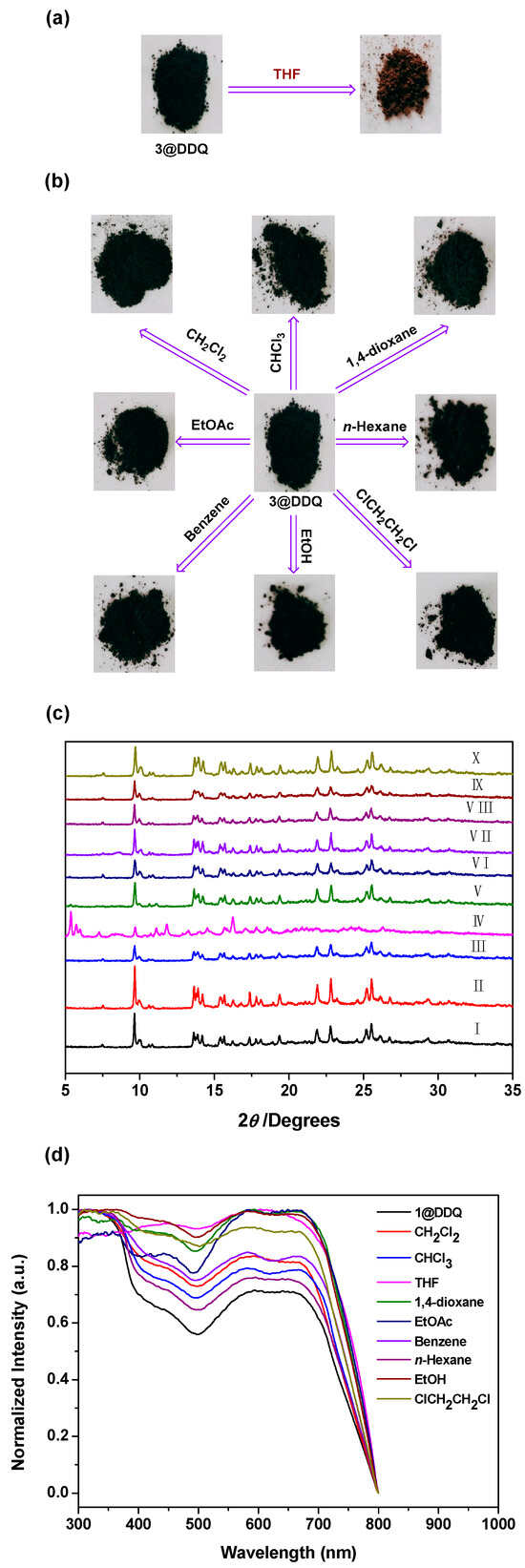 Photographs of 3@DDQ after exposure to various vapors (a,b); (c) PXRD patterns of 3@DDQ before (I) and after (II) exposure to CH2Cl2, (III) CHCl3, (IV) THF, (V) 1,4-dioxane, (VI) EtOAc, (VII) benzene, (VIII) n-hexane, (IX) EtOH and (X) ClCH2CH2Cl; (d) diffuse reflectance spectra of 3@DDQ before and after exposure to various vapors.