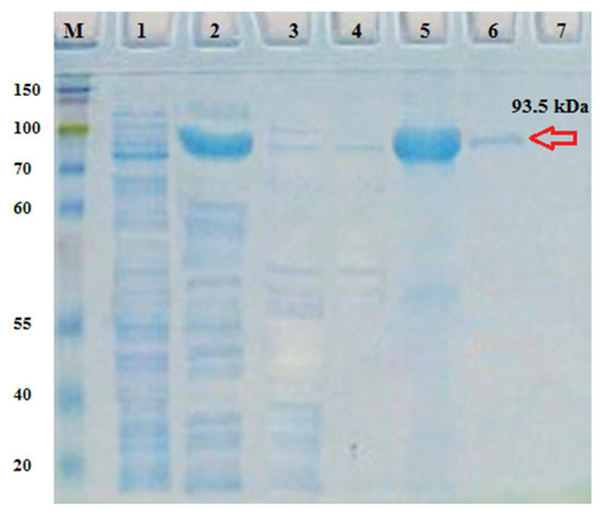 Purification of recombinant Mycobacterium tuberculosis ClpC1: electrophoretic analysis of affinity chromatography using Ni-TED resin. M: maker; 1: non-induced pET28a(+)/ClpC1; 2: induced pET28a(+)/ClpC1; 3, 4: washing fractions; and 5, 6, 7: elution fractions.