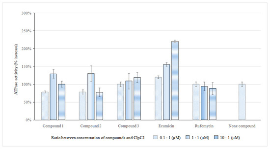 Several compounds, such as ecumicin and rufomycin, have been reported to inhibit ClpC1 through the effection of ATP hydrolysis function [10,14,15]. Therefore, these compounds were used as positive controls in this study. Different concentrations of compounds 1, 2, and 3 (0.1 µM, 1.0 µM, and 10.0 µM) were evaluated and optimized for the ATPase activity of the ClpC1 protein. The results showed that ATPase activity increased gradually with the concentration of compound 3 (Figure 5). It was observed that compound 3 was effective for the ATP hydrolysis of ClpC1 protein, similarly to ecumicin, but with lower ATP hydrolysis affection, while compounds 1 and 2 did not affect the ATPase activity of ClpC1. The above results suggested that compound 3 directly targeted the ClpC1 protein of M. tuberculosis through the affection of ATPase activity. Comparing the structure of compound 3 to those of potential macrocyclic compounds that inhibited ClpC1, such as ecumicin, rufomycin, lassomycin, compound 3 was a hexapeptide with a simpler structure, suggesting the total synthesis and structural modification to enhance the ClpC1 inhibition.