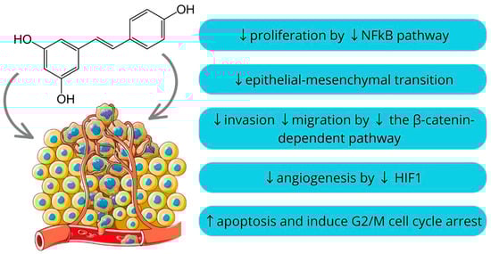 Resveratrol is a naturally occurring polyphenol found in various plants, including grapes, berries, and peanuts. It is particularly noted for its presence in red wine. It has the potential to positively impact both the prevention and management of inflammatory disorders and cancer as well as slowing the aging process [97,98,99]. It is comprised of a pair of phenolic rings connected by a double styrene bond, creating the structure known as 3,5,4′-Trihydroxystilbene [100]. Earlier research illustrated that resveratrol has pleiotropic effects instead of depending on a single mode of action. It has been shown that resveratrol inhibits proliferation by downregulating NFkB, inhibits epithelial-mesenchymal transition dependent on TGF β/Smad, decreases the β-catenin-dependent pathway to impede invasion and migration, and influences angiogenesis by inhibiting HIF-1 and expediting its ubiquitination [101,102,103,104]. Moreover, an oral squamous cell carcinoma cell lines study showed that resveratrol induces apoptosis and G2/M phase cell cycle arrest [105]. However, determining the optimal dosage of resveratrol for maximizing its health benefits while mitigating the risk of toxicity represents a significant and ongoing area of scientific inquiry [106]. Nonetheless, resveratrol’s capacity to target various aspects of tumor development has enhanced its value as a supplementary agent in combination with other treatments, enhancing its efficacy through synergy (Figure 2) [98].