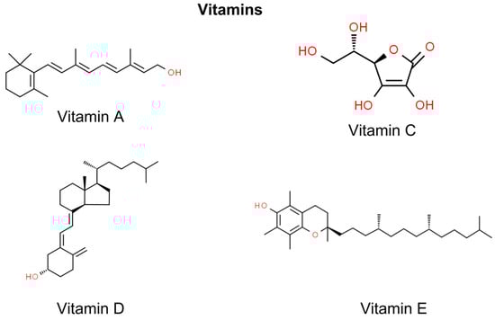 Vitamins have emerged as potential therapeutic agents in the prevention and treatment of NMSC, the most prevalent form of skin cancer. Retinoids, derivatives of vitamin A, are significant for their regulatory effects on keratinocyte growth, which is crucial in NMSC management [141]. Vitamin D, known for its role in bone health, exhibits the potential to modulate cell proliferation and immune responses in skin carcinogenesis [142]. Antioxidants such as vitamin C and vitamin E are also pivotal, with their free radical scavenging properties aiding in skin cancer prevention [143,144]. While promising, the efficacy and safety of these vitamins, particularly at pharmacological levels, warrant further clinical investigation to optimize their use in NMSC therapeutic strategies (Figure 4).