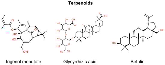 The most investigated terpenoid in terms of non-melanoma skin cancer is inegnol mebutate, a diterpene ester isolated from the Euphorbia peplus plant [160]. Its anti-proliferative activity comprises mitochondrial swelling, disruption of membrane potential, and a decline in adenosine triphosphate synthesis that causes necrotic cell death [161]. Furthermore, residual dysplastic epidermal cells may be eliminated through neutrophil-mediated antibody-dependent cytotoxicity [162]. Notably, ingenol mebutate represents the natural compound that has progressed to clinical trials for the treatment of NMSC. In 2013, ingenol mebutate (Picato®) obtained marketing authorization from the European Medicines Agency (EMA) for the topical treatment of non-hyperkeratotic, non-hypertrophic AK in adults [163]. The EMA mandated a study to investigate the risk of SCC associated with ingenol mebutate. The results of the 3-year safety study revealed a higher incidence of skin cancer, leading the EMA to recommend suspending the license for ingenol mebutate gel in 2020 as a precaution pending further review. The Medicines and Healthcare products Regulatory Agency (MHRA) reported that the final study results among 484 patients indicated a higher occurrence of SCC in those using ingenol mebutate gel compared with imiquimod (3.3% vs. 0.4%) [164,165,166]. Stocks of the gel have been recalled in the UK and Canada, and clinicians have been advised to cease prescribing it and explore alternative treatments for AK [165,167].