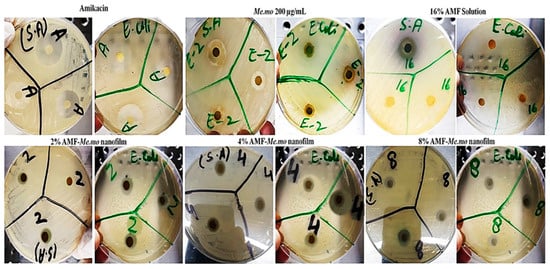 The imbalance between the local pathological factors and immune system integrity at the wound site may encourage the colonization of both Gram-positive and Gram-negative bacteria. Among all, the most detected bacterial strain at the site of injury are Staphylococcus aureus and Escherichia coli []. Therefore, the antibacterial activity of biosynthesized AMF-Me.mo-loaded nanofilms was evaluated against these clinical pathogens (S. aureus and E. coli) using disc diffusion assay. A clear zone of inhibition (ZOI) was observed around discs loaded with 2%, 4%, and 8% AMF-Me.mo nanofilms, a single AMF solution, and a methanolic extract of Moringa olifera and amikacin. The findings clearly depicted that AMF-Me.mo-loaded nanofilms showed a considerable inhibitory pattern against both bacterial strains in a concentration-dependent manner (2% < 4% and < 8%). Moreover, simple AMF and Me.mo extract also exhibited significant antimicrobial effects like the nanofilms. Overall, the test samples showed comparable effects (p < 0.001) with amikacin, as detailed in the previous studies.