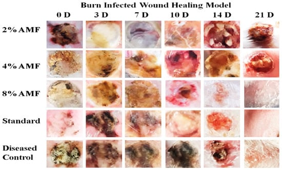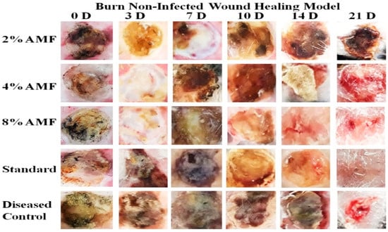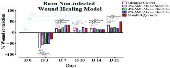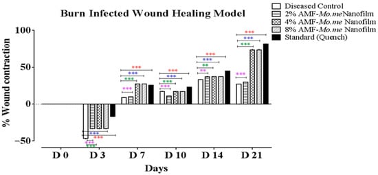 Table 5 shows the effect of AMF-Me.mo on non-infected wounds. On the third day, percent wound contraction was observed to be increased in the standard group and the  2%, 4%, and 8% AMF-Me.mo treatment groups significantly (p ˂ 0.001) compared with the diseased control. A negative sign indicates inflammation. On the seventh day, percentage contraction was significantly (p ˂ 0.01) increased in the 2%, 4%, and 8% AMF-Me.mo-loaded nanofilms and the Quench® cream-treated groups as compared with the control. On the 10th day, the values of the percent wound contraction were raised efficiently, depicting a dose dependent healing response of the 2%, 4%, and 8% AMF-Me.mo treatment groups. In addition, the standard and 8% AMF-Me.mo-treated animals showed comparable effects (p ˂ 0.001). On the 14th day, percentage contraction was significantly (p ˂ 0.01) increased in the 2%, 4%, and 8% AMF-Me.mo-loaded nanofilm treatment groups compared with the diseased control. On the 21st day, the AMF-Me.mo treatment groups (2%, 4%, and 8%) exhibited statistically significant (p ˂ 0.001) wound healing potential as compared with the diseased control group. Moreover, the Quench® cream- and the 8% AMF-Me.mo-treated animals produced a comparable reduction in inflammation at the wound site, thus demonstrating notable wound healing effects throughout the study (Figure 4 and Figure 5).