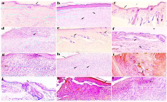 Histopathological analysis of infected burn wound healing animals treated with Quench® (a,b) and 8% (c,d), 4% (e–g), and 2% (h,i) AMF-Me.mo-loaded nanocomposites and diseased control (j–l) group, respectively. The arrows in this figure represent the above-mentioned processes (granulation tissue formation, occurrence of blood vessel growth, development of fibroblasts, scab formation, hypertrophy, atrophy, and the infiltration of macrophages and neutrophils in various images) as indicated by arrows.
