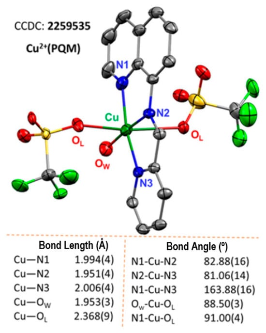 Cu2+(PQM) was prepared by stirring the synthesized PQM ligand with Cu(OTf)2 in ethanol at an ambient temperature for 5 h. The resulting Cu2+(PQM) complex exhibited a green color and was filtered and recrystallized using a mixture of EtOH and DCM (1:6). The FT-IR spectra of the Cu2+(PQM) complex showed distinctive stretching peaks of the azomethine group at approximately 1610 cm−1. This complex was characterized using powder and single-crystal X-ray diffraction studies.