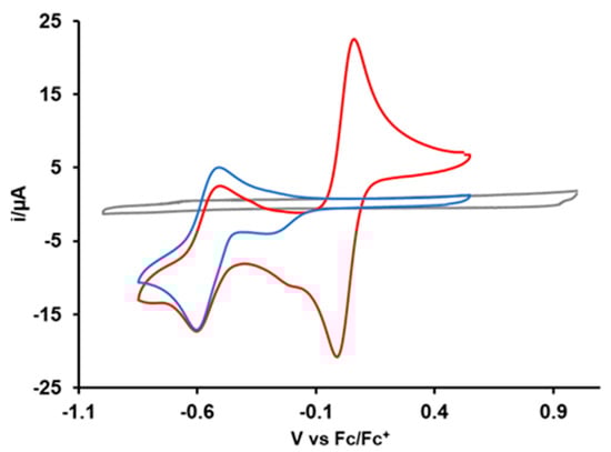 Cyclic voltammograms of solvent/acetonitrile (gray), 1.0 mM solution of Cu2+(PQM) complex (blue), and Cu2+(PQM) with ferrocene (red) at a scan rate of 0.1 V/s.