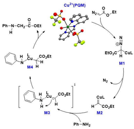 The following supporting information can be downloaded at: https://www.mdpi.com/article/10.3390/molecules29030730/s1, General synthetic procedures; Figure S1: Cu2+(PQM) LeBail refinement fitting profile of PXRD and single-XRD; Figure S2: Cu2+(PQM) complex crystalline phase PXRD; General catalytic procedures; Tabulated Spectroscopic data; Figure S3: HPLC spectra of compound 3o and integration data; Figure S4: 1H NMR spectra of compound 3o; Figure S5: 13C NMR spectra of compound 3o; Figure S6: 19F NMR spectra of compound 3o; Figure S7: HRMS data for the compound 3o; General kinetic procedures; Figure S8: N–H insertion reaction kinetics plot for compound 3a; Figure S9: N–H insertion reaction kinetics plot for compound 3b; Figure S10: N–H insertion reaction kinetics plot for compound 3c; Figure S11: N–H insertion reaction kinetics plot for compound 3d; Figure S12: N–H insertion reaction kinetics plot for compound 3e; Figure S13: N–H insertion reaction kinetics plot for compound 3f; Figure S14: N–H insertion reaction kinetics plot for compound 3g; Figure S15: Cu2+(PQM) complex crystal view on mounted on a cryoLoop. Figure S16: Crystallographic data, structure of Cu2+(PQM) complex, and related report; Table S1: Sample and crystal data for Cu2+(PQM) complex; Table S2: Data collection and structure refinement for Cu2+(PQM) complex. References [,,,,,,,,,,,,,] are cite in the Supplementary Materials.