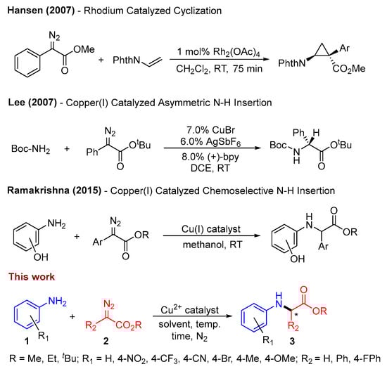 - Ramakrishna, K.; Murali, M.; Sivasankar, C. Chemoselective Carbene Insertion into the N–H Bond over O–H Bond Using a Well-Defined Single Site (P–P)Cu(I) Catalyst. Org. Lett. 2015, 17, 3814–3817. [Google Scholar] [CrossRef] [PubMed]