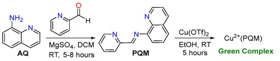 The tridentate PQM ligand was synthesized in a one-step reaction based on its 8-aminoquinoline framework, as outlined in Scheme 2. The purified PQM ligand was coordinated with copper(II) to generate a green-colored Cu2+(PQM) complex, which was re-crystallized using a mixture of EtOH and DCM (1:6).