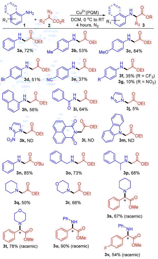 A 10-mL vial was charged with a magnetic stir bar, 0.5 mmol of anilines or related amines (1a–1n), 1.0 mmol of diazo-compounds (2a–2c), and 0.05 mmol of Cu2+(PQM). This mixture was solvated in 3.0 mL of dichloromethane (DCM) and the reaction was started at 0 °C to ambient temperature with stirring for approximately four hours under an N2 atmosphere. After the completion of the reaction time, the resulting reaction mixture was diluted with ethyl acetate and filtered through a thin pad of celite. The filtrate was evaporated under reduced pressure, and subsequent purification via column chromatography on silica gel afforded the desired products (3a–3o) obtained in the yields of roughly 90–10%. A summary of the characterization data for each known complex is provided in the Supplemental Information (SI) section associated with this work. The full characterization data is also included in the SI section for compound 3o, including chiral HPLC traces, 1H, 13C, and 19F NMR data, and high-resolution mass spectrometry data.