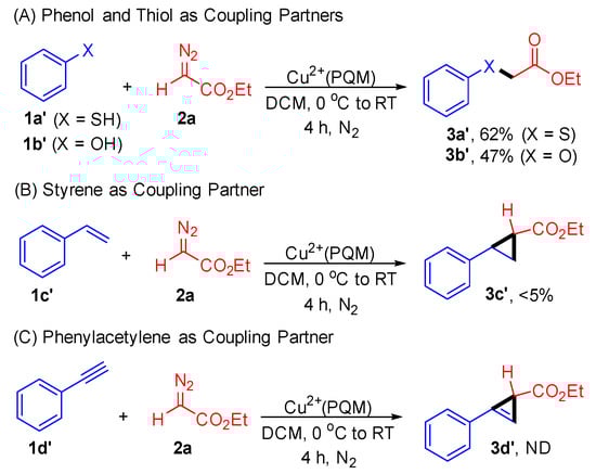 Furthermore, we demonstrated the compatibility of this approach with phenol (1a’) and thiophenol (1b’) substrates. The reaction yielded C–O and C–S products with acceptable yields (Scheme 4). When investigating the reaction of styrene (1c’) and phenyl acetylene (1d’) with ethyl diazoacetate (2a) in the presence of the Cu2+(PQM) catalyst, product 3c’ was obtained in a yield of less than 5%, while product 3d’ was not detected. These results underscore the complementarity and orthogonality of the Cu2+(PQM) catalyst in facilitating carbene transfer reactions.