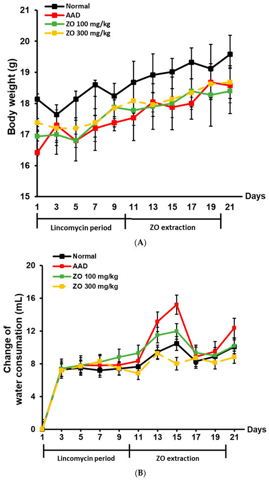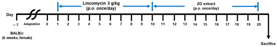 Animal experiments were conducted as per the guidelines of the Institutional Animal Care and Use Committee (IACUC) at Gachon University (Approval No: GU1-2022-IA0050-00). BALB/C mice (seven weeks, female) were purchased from OrientBio (Seoungnam, Korea). The experimental animals were exposed to a 12 h light–dark cycle and provided ad libitum access to food and water in an environment with a temperature of 22 ± 2 °C and humidity of 50–55%. After a 7-day adaptation period, the animals were assigned to the following groups: control (normal), antibiotic-induced-diarrhea (AAD), low-dose treatment (AAD + ZO 100 mg/kg), and high-dose treatment groups (AAD + ZO 300 mg/kg). Subsequently, the control group received oral administration of physiological saline, and the AAD group received oral administration of lincomycin (Dongkwang Pharm, Seoul, Korea) at a concentration of 3 g/kg once daily for ten days. After the completion of lincomycin administration, both the control and AAD groups received oral administration of sterilized 0.5 w/v % methyl cellulose 400 solution (CMC) (Wako, Tokyo, Japan). The ZO group was orally administered lincomycin for ten days and subsequently orally administered concentrations of 100 or 300 mg/kg for ten days (Figure 5).