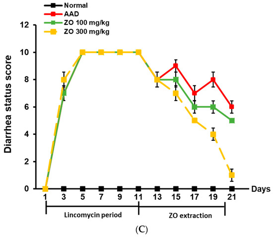 To evaluate the ameliorative effects of ZO extract in an AAD mouse model, parameters including weight, diarrhea status score, and water intake were analyzed. During the treatment period using lincomycin, the rate of increase in weight was significantly lower in the group that received the antibiotic agent than in the normal group (Figure 1A). The group that received lincomycin showed an increase in water intake (Figure 1B). However, the rate of increase in weight was slightly higher in the ZO extract group than in the AAD group, confirming the likelihood of normalization. Furthermore, the increased water intake due to the use of lincomycin in the ZO extract group (100 and 300 mg/kg) was similar to the level of water intake of the normal group.