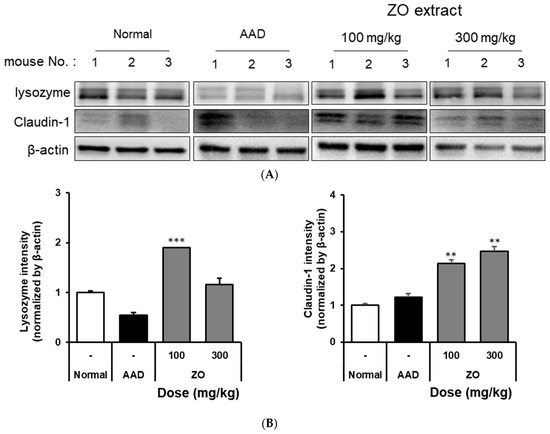 The effect of oral administration of ZO extract on lysozyme and claudin-1 expression in the AAD model. AAD mice were orally administered the ZO extract (100 mg/kg or 300 mg/kg) daily for ten days. The intestinal tissue was extracted using a radioimmunoprecipitation assay buffer. Lysozyme and claudin-1 protein expression were determined by immunoblotting. β-actin was used as an internal loading control (A). Lysozyme and claudin-1 expression were analyzed using Image J software (B). Data are presented as the mean ± standard deviation (SD) of triplicate experiments. ***, p < 0.0001 and **, p < 0.001 vs. the AAD group.