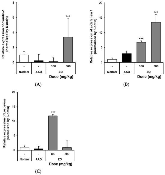 Effects of oral administration of ZO extract on lysozyme and claudin-1 mRNA expression in the AAD model. AAD mice were orally administered ZO extracts (100 mg/kg or 300 mg/kg) daily for 10 days. Intestinal RNA was extracted and claudin-1 (A), α-defensin1 (B), and lysozyme (C) mRNA expressions were determined by RT-qPCR. Data are presented as the mean ± standard deviation (SD) of triplicate experiments. ***, p < 0.0001 vs. the AAD group.