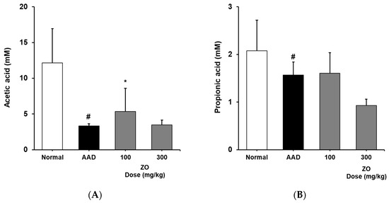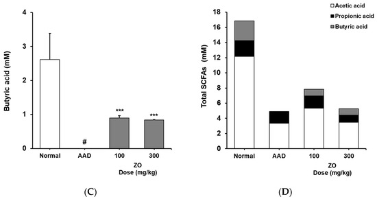 We analyzed the effects of the ZO extract on SCFA levels in the appendix in the lincomycin-induced-diarrhea mouse model and found that the concentration of acetic acid in the AAD group decreased from 12.2 ± 4.8 to 3.3 ± 0.3 mM (Figure 4). In contrast, the concentrations of acetic acid in the groups that received 100 and 300 mg/kg of ZO extract were 5.3 ± 3.2 and 3.5 ± 0.7 mM, respectively. In the control group, the concentration of butyric acid was 2.6 ± 0.6 mM. In the AAD group, butyric acid was not detected. In the groups that received 100 and 300 mg/kg of ZO extract, the concentrations of butyric acid were 0.9 ± 0.1 and 0.8 ± 0.0 mM, respectively, indicating a recovery of butyric acid levels. The concentration of propionic acid in the AAD group decreased from 2.1 ± 0.6 to 1.6 ± 0.3 mM. No significant change in the concentration of propionic acid was found in the groups that received ZO extract compared to that in the AAD group (Figure 4). This result may be observed due to the effect of dietary fibers that contribute to the production of SCFAs and the composition of monosaccharides residing in crude polysaccharides, the major substance of ZO extract. Therefore, further studies on the composition of monosaccharides of ZO extract are required.