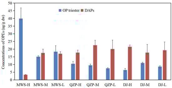 Overall, the total concentration of the main individual OP triesters detected in all the sites ranked as TCIPP (43.83 ng/g dw) > TPHP (21.61 ng/g dw) > TNBP (19.70 ng/g dw) > TEHP (15.76 ng/g dw) ≈ TCEP (14.13 ng/g dw), while the detailed compound composition varied among different areas (Figure 2). For the MWS mangrove, TCIPP was predominant, accounting for 34% of the Σ12OPtri level in this area, followed by TCEP (17%), TEHP (17%) and TPHP (16%). For the QZP mangrove, TPHP accounted the highest concentration proportion of 33%, followed by TNBP (28%) and TCIPP (25%). Similar with the MWS mangrove, TCIPP accounted for most (46%) in the DJ mangrove area; however, TNBP and TMPP were secondly abundant compounds with proportions of 19% and 16%. TCIPP and TCEP are the two most frequently used OP triesters in industry as flame retardants [46] and were widely detected as major compounds in lots of coastal areas due to their large industrial production and persistent property in the environment [46,47,48,49]. The mangrove forests of MWS and DJ receive household and industrial wastewater discharge from the surrounding urban and rural areas, which leads to a high amount of TCIPP and TCEP. In the meantime, due to the mutagenicity and carcinogenicity of TCEP, it has been replaced by TCIPP gradually in recent years [46,50]. This could explain the result of TCIPP as the predominant OP triester in present study. TPHP is mainly used as flame retardants in electronic products, while TNBP is mainly used as plasticizers and lubricants [46]. Therefore, the household waste and shipping activities, especially in the QZP area, may be the main sources of TNBP and TPHP in the QZP and DJ mangrove forests.